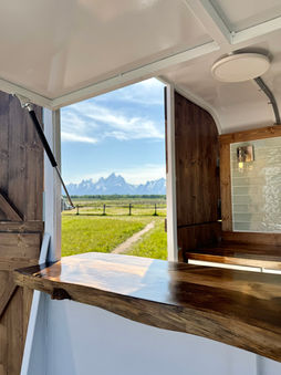 This Stallion bar was designed for a guest ranch in the heart of the Teton Valley, inspired by the natural beauty that surrounds it. Tea green tile, warm rustic wood, and creamy full-size kitchen cabinets create a refined yet grounded aesthetic. Outfitted with a beverage fridge, ice bin, beverage sink, and full interior electrical—including overhead lighting and outlets—it’s built for seamless service and unforgettable gatherings.