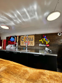 Crafted from the bed of a 1950s Ford, this one-of-a-kind tap truck blends vintage charm with rugged character. Its sleek black body is complemented by a rustic accent wall made from reclaimed Wyoming snow fence. A live edge wood bar slab adds a touch of natural elegance, inviting guests to gather and enjoy. Tucked beneath a corrugated metal roof, the built-in Cold Break tap system is seamlessly integrated into the wall, allowing for effortless self-serve pours.