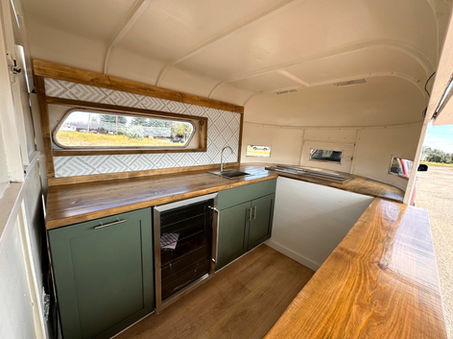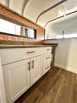 Created for a mobile coffee shop, the Boho Bean showcases a warm, eclectic aesthetic inspired by Bohemian design. Key features include terracotta scalloped tiles, artistic star-patterned flooring, slatted wood doors, copper accents, forest green cabinetry, and light-stained wood finishes. The interior is thoughtfully outfitted with two beverage fridges, full-sized shaker-style kitchen cabinets, an ice bin, a hand-washing sink, a three-compartment sink, and a stunning live-edge bar slab.