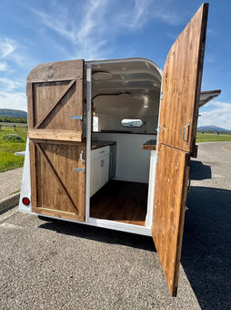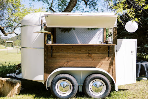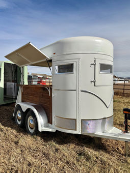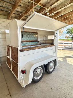 This vintage 2-horse trailer was transformed into one of our most eye-catching Stallion builds yet. Inside, crisp white shaker cabinets pair with a beverage fridge and a 4-compartment sink for full functionality. The back opens with rustic barn doors, setting the stage for a warm and welcoming serving space. Teal hexagon tile adds a bold pop of character, while a custom built-in shelf gives the perfect spot for décor and bottle displays. Vintage roots meet timeless design — making this build as practical as it is eye-catching.